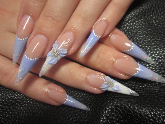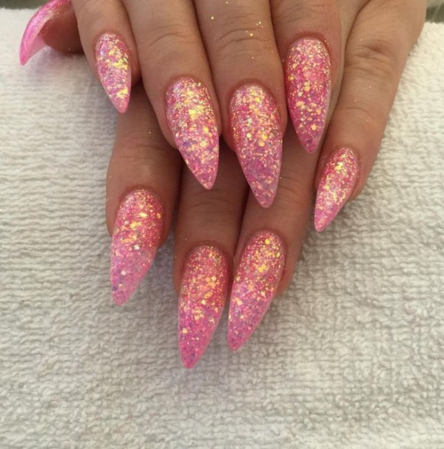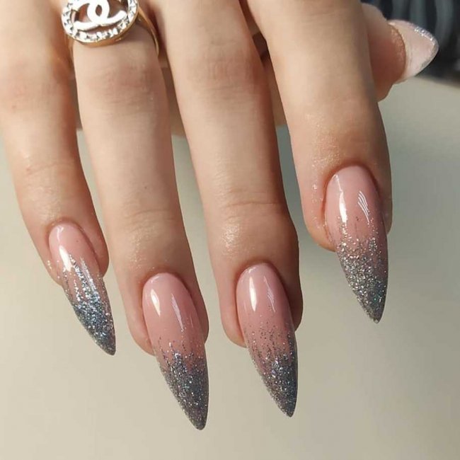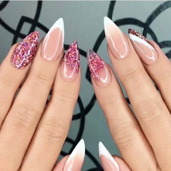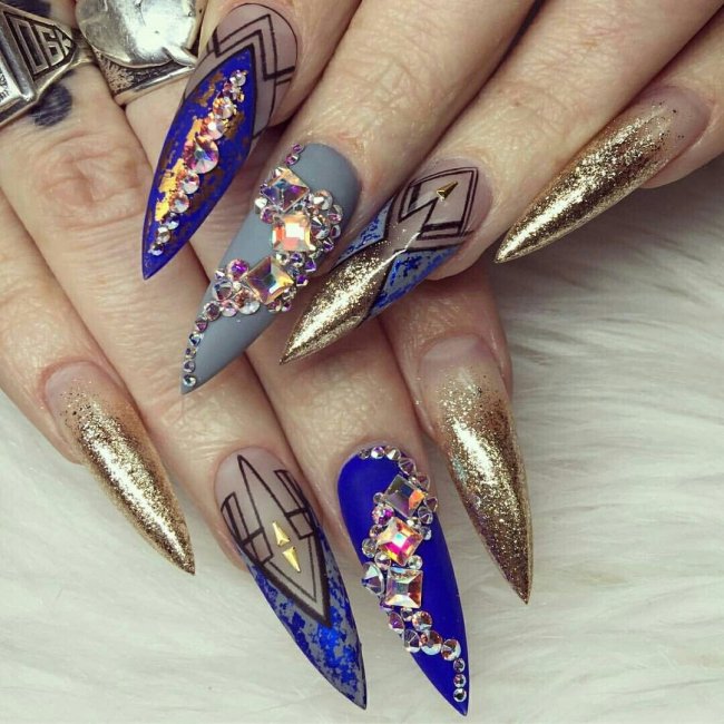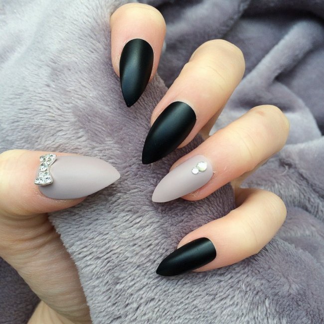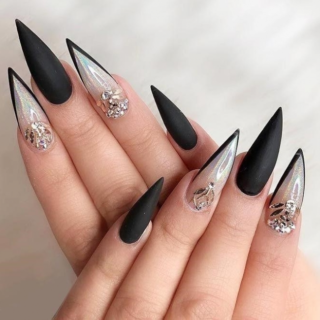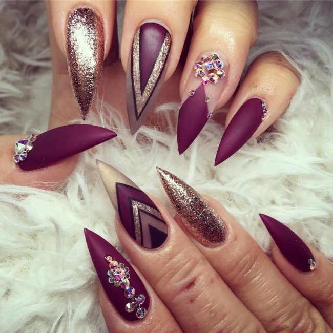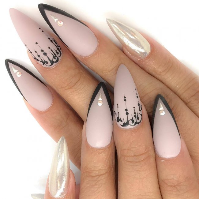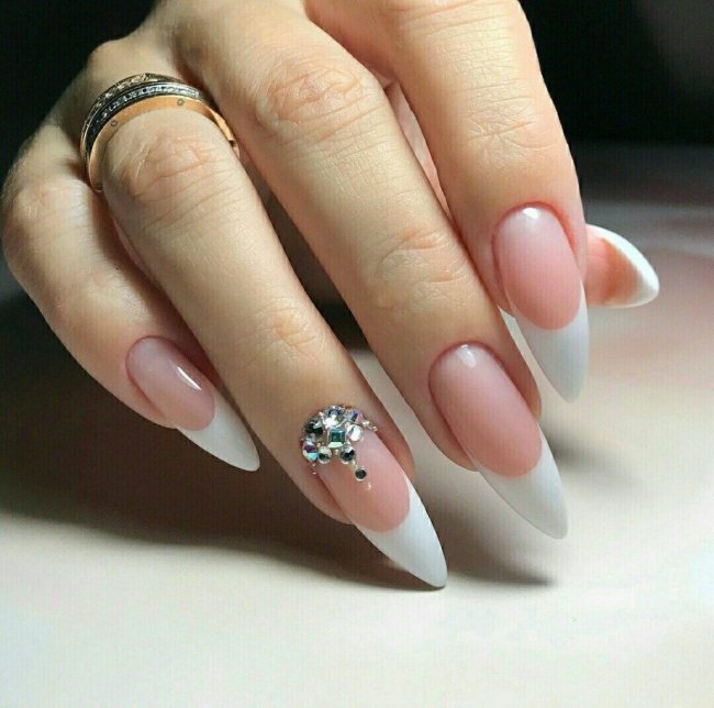По-прежнему актуальными для маникюра на ногти острой и любой другой формы будут стразы и блестки. Эти элементы декора подойдут для самых разных образов: