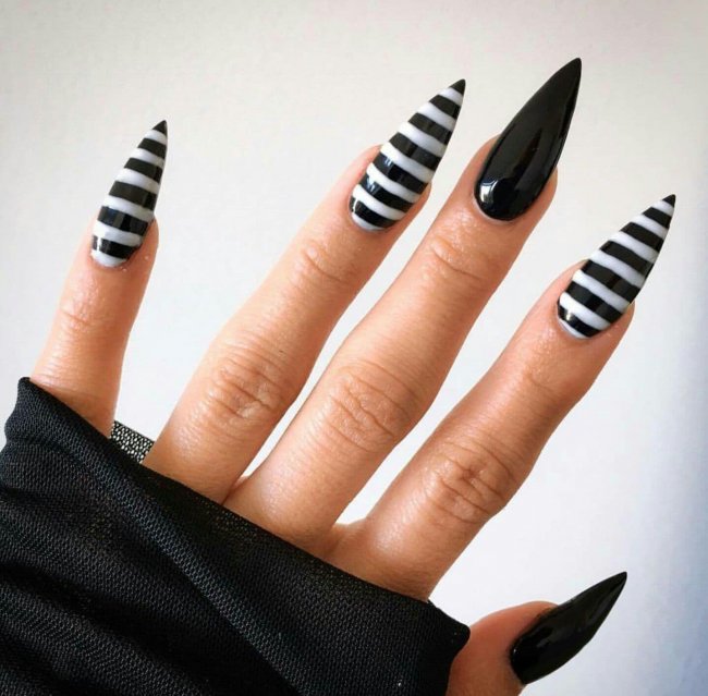 На острых ногтях минимализм смотрится довольно изысканно, несколько сглаживая агрессивность формы.