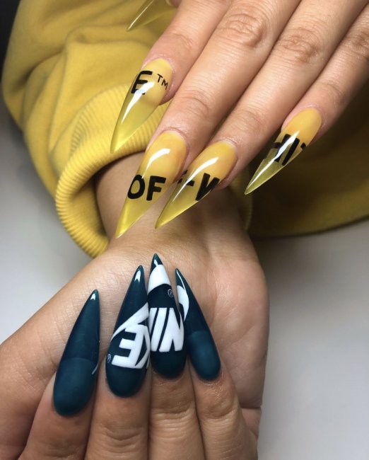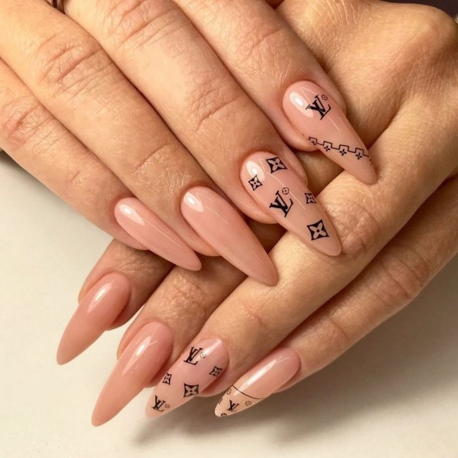 Использование логотипов известных брендов. Тем, кто предпочитает носить одежду от известных кутюрье, уместно будет использовать их логотипы и в маникюре. К наиболее востребованным относятся Givenchy, LouisVuitton и Valentino S.p.A.