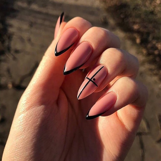 Для ногтей острой формы будет большой выбор вариаций дизайна как в повседневном, так и праздничном стиле. Одним из самых востребованных в 2022 году будет граничный маникюр, при котором основной фон подчеркивается тонкой линией черного цвета, расположенной по краю ногтя.