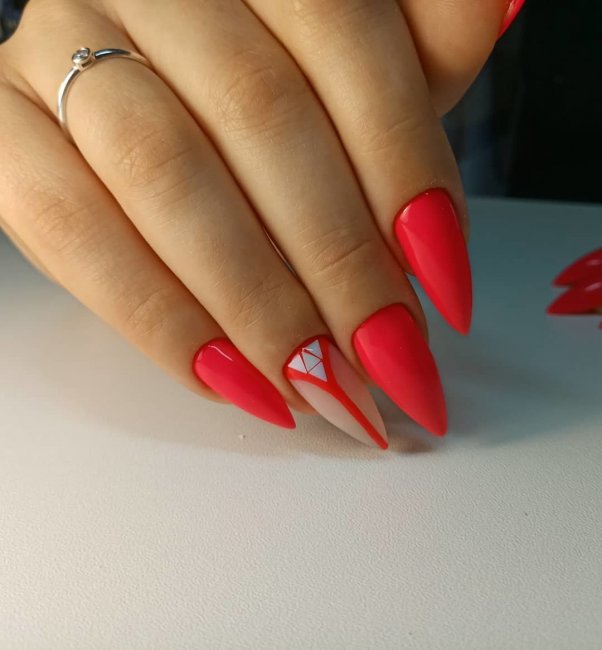 Не менее интересно на острых ногтях будут смотреться лунки треугольной формы. При этом допускается совмещать покрытие противоположных цветов.