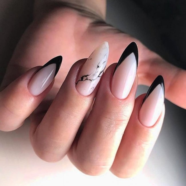 Кроме того, к модным новинкам дизайна острых ногтей в 2022 году можно отнести использование черного цвета в мраморной технике.
