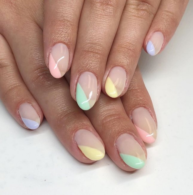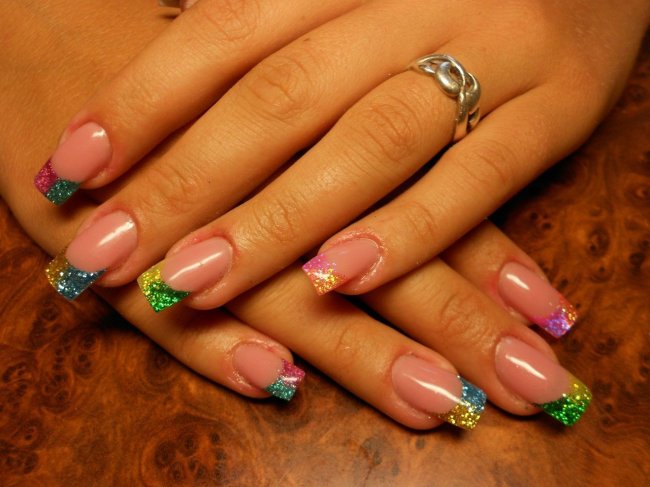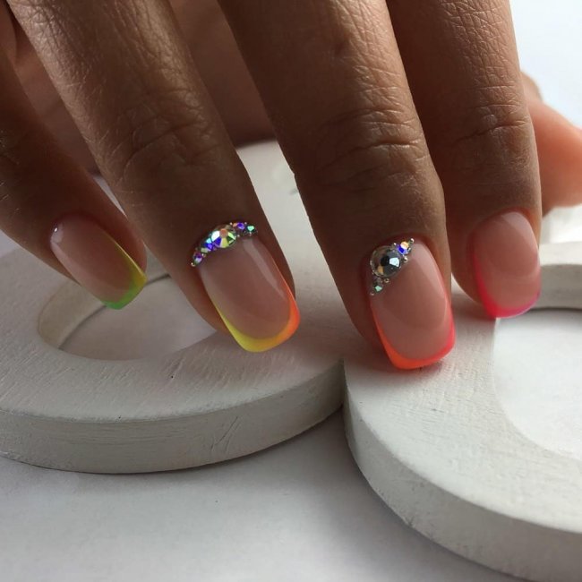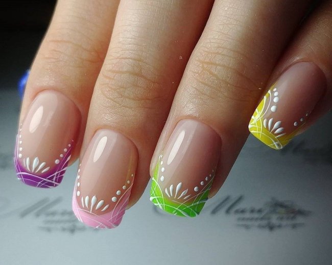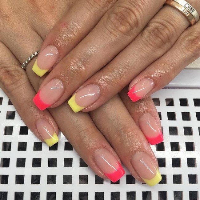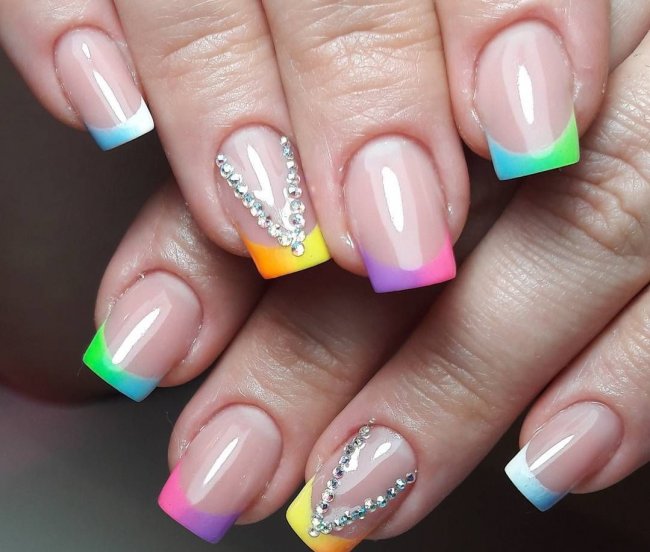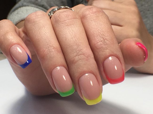 Разноцветный френч подходит для любой формы ногтей. Он одинаково привлекательно смотрится и на длинном миндале, и на коротком квадрате.