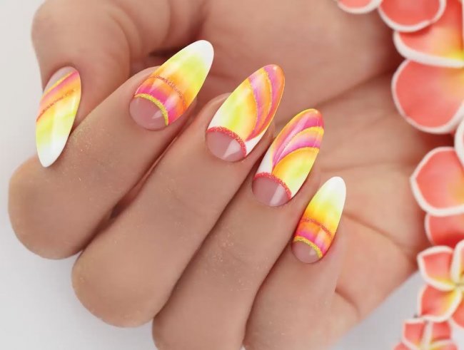 Если хочется создать на руках яркий маникюр, то следует обратить внимание на гель-лаки неоновых цветов. Необычный дизайн можно создать, использовав асимметрию, рисунки или наклейки. Также стилисты советуют летом попробовать матовое покрытие и разноцветный френч.