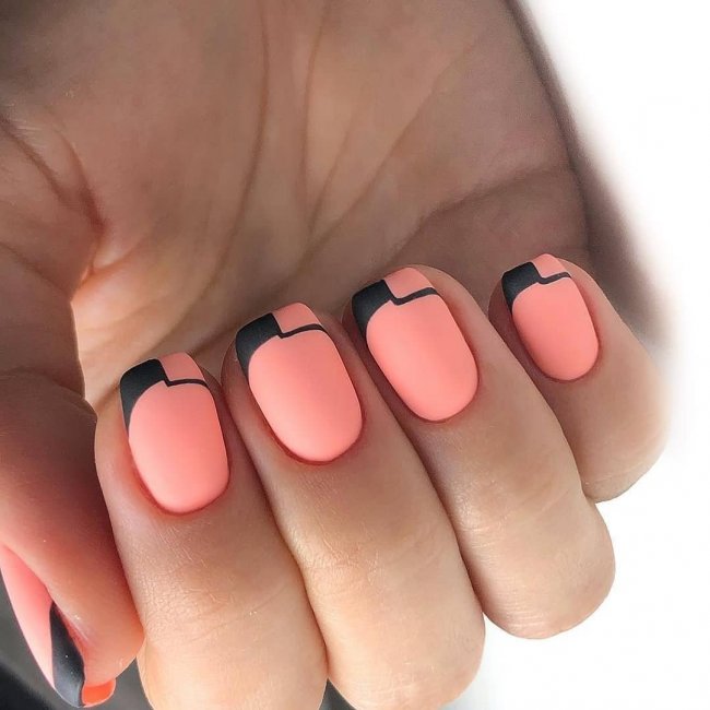 Этот вариант маникюра обычно создается с помощью одного цвета для полоски френча и подложки. Выполняется он просто — весь ноготь покрывается лаком, с помощью матового и глянцевого топов наносится полоска френча.