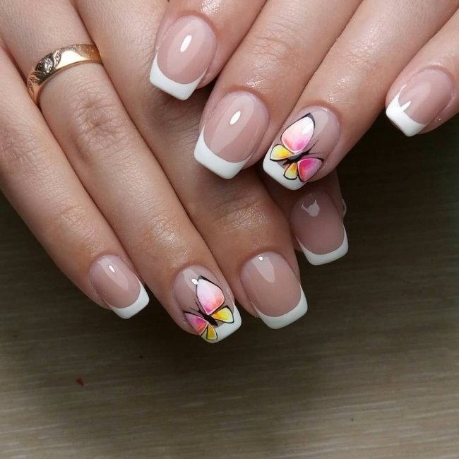 Классический вариант френча с линией белого цвета подойдет в этом случае идеально. Подложку следует выбирать естественного цвета или полупрозрачную, чтобы не «утяжелять» дизайн. Белый цвет добавляет свежести, что идеально для летнего маникюра.