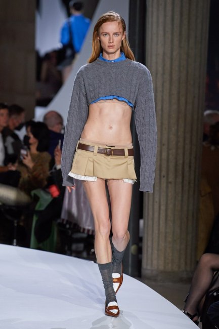 Miu Miu весна-лето 2022Итальянский модный Дом Miu Miu перенес нас в ту самую эпоху 2000 года с показом коллекции весна-лето 2022, представив ряд микро-мини-юбок. Подобные модели, только дополненные разрезами, представили и Versace. Еще одним хитом весенне-летнего сезона стали джинсы с ультранизкой посадкой мешковатого силуэта. Подобная модель привлекала к себе внимание в течение последних нескольких сезонов, но благодаря показам Missoni, Blumarine, MSGM и многим другим стало понятно, что джинсы с низкой посадкой вернулись окончательно.
