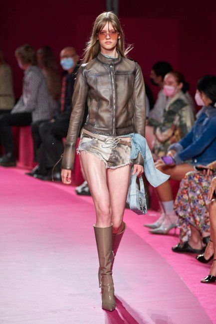 Diesel весна-лето 2022Кожаная куртка – краеугольный камень мотоциклетного стиля. Именно этот грубый, прочный, но в то же время утонченный предмет одежды дизайнеры всячески интерпретировали в весенне-летнем сезоне. Сара Бертон в своей коллекции для Alexander McQueen представила структурированные кожаные куртки с эффектными лацканами, карманами и воротниками. Для создания более незаурядного силуэта Бертон сочетала укороченную кожаную куртку с юбкой из тюля и массивными ботинками. Подобные по настроению решения использовал и Демна в Balenciaga. Грузинский дизайнер сочетал обтягивающие сетчатые топы с огромными кожаными куртками со спущенными плечами и мешковатыми рукавами.