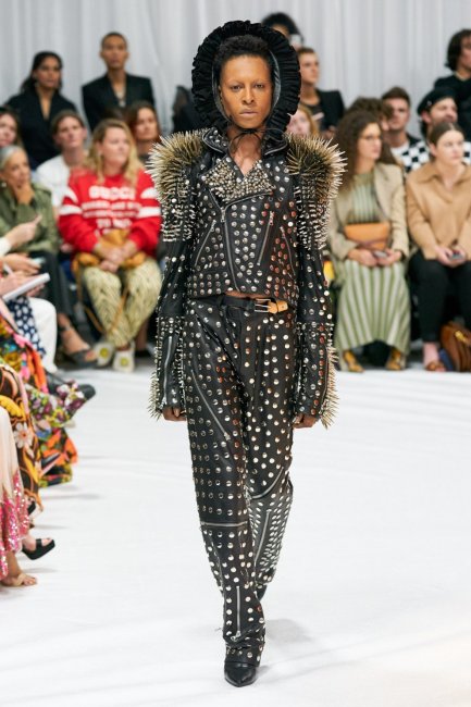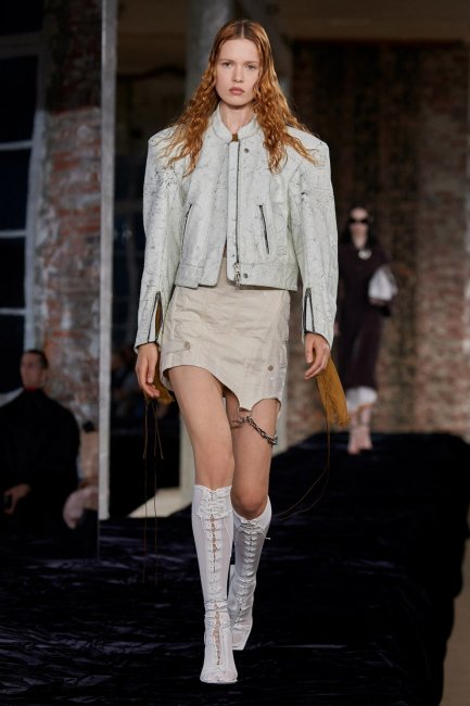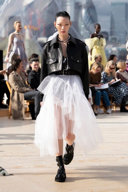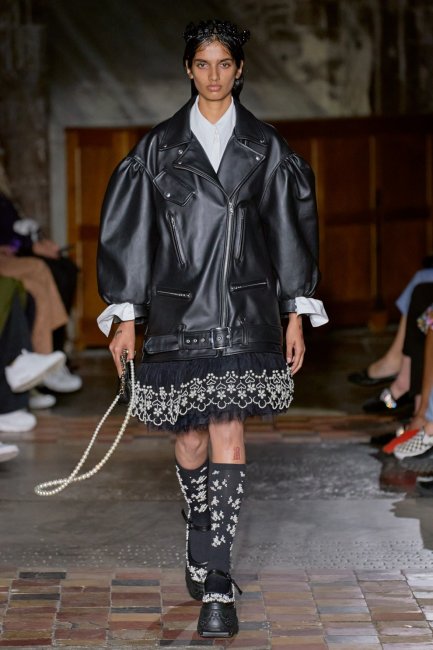 Simone Rocha весна-лето 2022Simone Rocha придал традиционному байкерскому образу свежий и современный вид: пышные рукава, эффектные лацканы и удлиненный силуэт. У Richard Quinn укороченная кожаная куртка походила на те, что Кейт Мосс любила в 1990-х. Она была украшена заклепками и шипами и сочеталась с соответствующими брюками на молнии и шляпкой. В Acne Studios появилась белая байкерская куртка из состаренной кожи с широкими плечами.