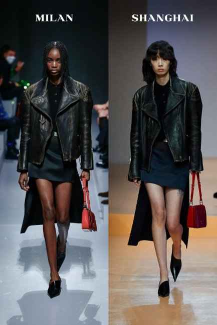 Balenciaga весна-лето 2022В коллекции Seduction, Stripped Down Миучча Прада и Раф Симонс переосмысливали современное восприятие сексуальности. В Prada модели одновременно вышли на подиум в Шанхае и Милане в идеально скроенных байкерских куртках из состаренной кожи. Атласные мини-юбки со шлейфом идеально дополняли потертую коричневатую кожу.
