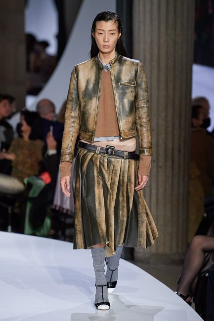 Miu Miu весна-лето 2022Миучча представила байкерские куртки и в коллекции Miu Miu. Среди бежевых ультра-мини-юбок и укороченных джемперов серого цвета появилась приталенная кожаная куртка с эффектом потертости и плиссированная миди-юбка из такого же материала. Пожалуй, только самые смелые поклонницы Miu Miu оседлают мотоцикл в таком ансамбле.