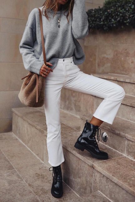 Наличие белых джинсов в гардеробе женщины — признак хорошего вкуса. Такие брюки можно сочетать как с классическим, так и с ежедневным стилем. Лучше всего джинсы белого цвета смотрятся в зимнем комплекте со свитером крупной вязки. На вид это очень уютное сочетание, которое подчеркивает белизну снега.