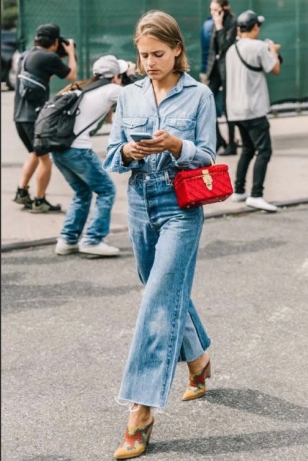 Широкие брюки очень удобны, они не сковывают движения, добавляют мобильности в повседневных делах. Один из таких фасонов — кюлоты. К счастью модниц, они бывают и из денима. Такая одежда прекрасно сочетается со спортивной обувью.