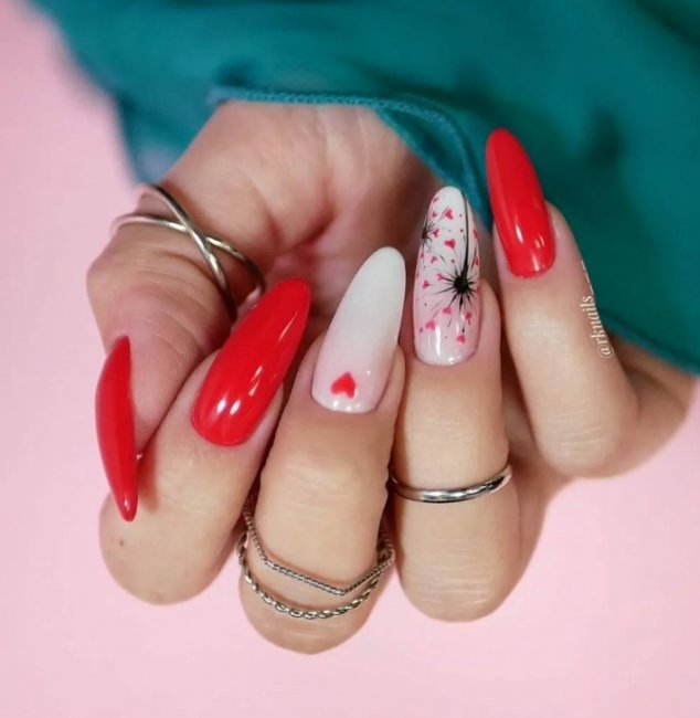 Эстетично и обворожительно будут смотреться золото и серебро в сочетании с красным. Акценты можно сделать как лаком с глиттером, так и с шиммером. В списке трендов также незамысловатые рисунки и фольга.