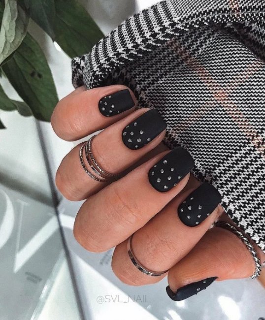 Яркости и шика своему черному маникюру можно добавить при помощи блесток, они внесут некую «изюминку». Также красиво подчеркнуть такой дизайн можно при помощи страз и камней.