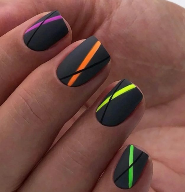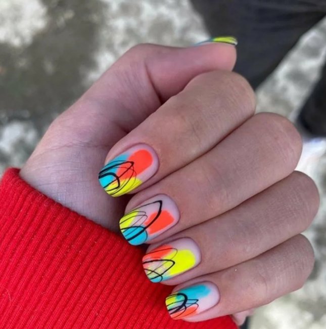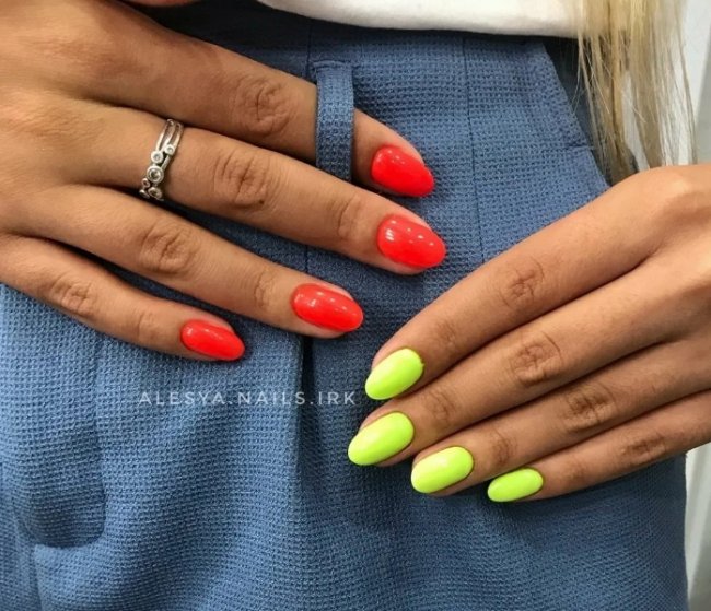 Для лета характерны яркие оттенки. Почему бы не сделать неоновый маникюр?! Такой дизайн точно не оставит вас без внимания. Интересно будут смотреться неоновые ногти в стиле французского маникюра. Для этого необходимо покрыть линию «улыбки» любимым цветом неонового лака. Можно добавить геометрические узоры или другие рисунки. Не бойтесь проявлять фантазию.