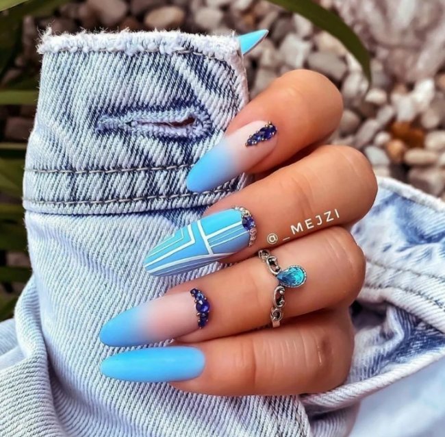 Еще один крутой модный тренд — маникюр «разные ручки». Очень красиво смотрится сочетание нежно-голубого и черного. Особенно если покрыть ногти матовым топом. Незаурядно и игриво будет выглядеть разноцветный дизайн. Для этого каждый ноготь нужно покрасить в разные оттенки. Но здесь нужно соблюдать одно важное правило: цвета должны сочетаться друг с другом. Только так вы сможете придать своим рукам очаровательный вид.