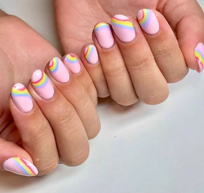 Главный тренд сезона — радужный маникюр. Это один из самых креативных дизайнов. Его суть заключается в том, чтобы использовать все оттенки радуги. Это оформление ноготков стало актуально не так давно, но уже взорвало списки модных трендов.
