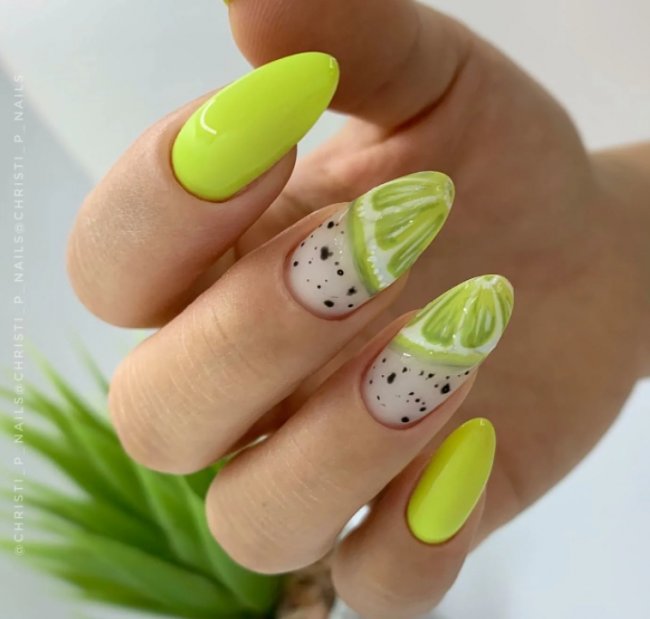 Летом нужно обязательно попробовать сделать «фруктовый» маникюр. Арбузы, дыни, киви, клубника и вишни — все это актуально в летний сезон. Маникюр с такими рисунками будет смотреться действительно по-летнему. С ним можно смело отправляться на пляж и покорять сердца мужчин.