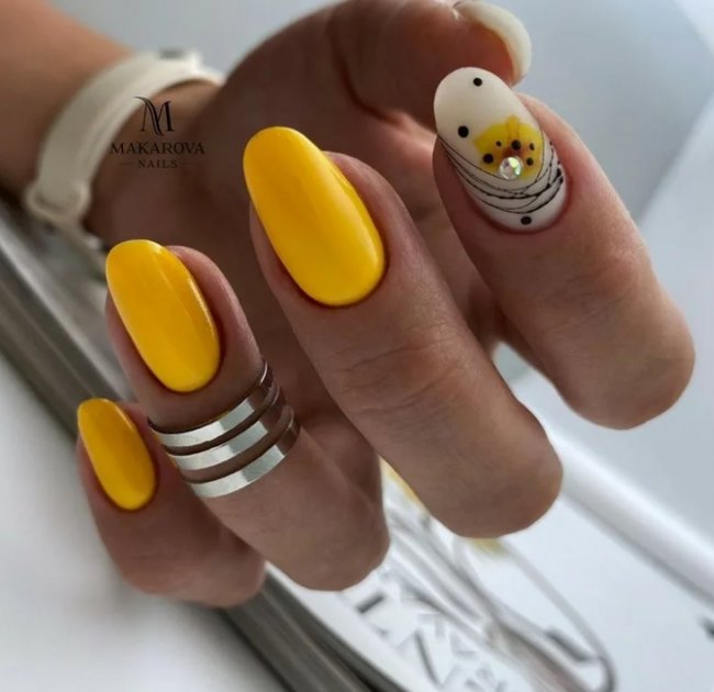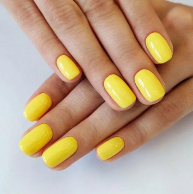 Такой маникюр будет несуразно смотреться на очень длинных ногтях и пластинах неестественной формы. Желтый цвет идеален на овальных или миндалевидных ногтях. Также актуальна форма ногтей «мягкий квадрат».