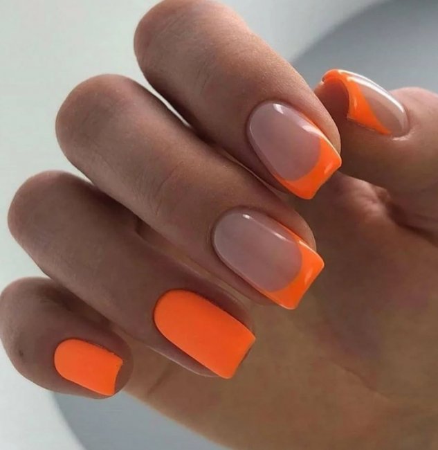 Оранжевый прекрасно сочетается со многими другими цветами. Это один из его основных плюсов. А матовый топ поверх оранжевого лака сделает ручки красивыми и элегантными.