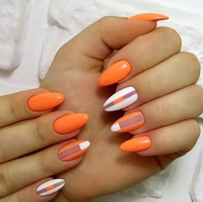 Здесь актуально будет добавить незамысловатые узоры. Они придадут оранжевому маникюру стильный и уникальный вид. Также можно поэкспериментировать с полосками, горошком, градиентом или френчем.