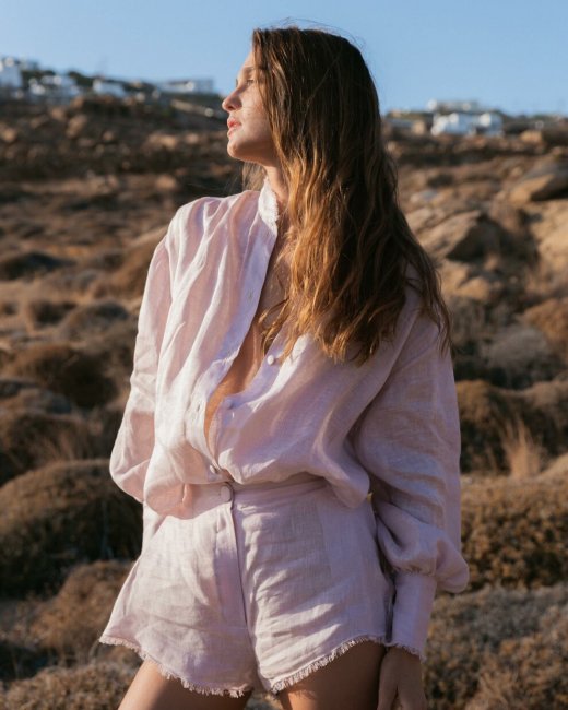 J'ammemeAtelier handmadeГоловними супутниками спекотних літніх днів цього сезону стане лляний костюм, що складається з сорочки та шорт, українського sustainable-бренду Atelier Handmade. В об'ємну сорочку з рукавами-ліхтариками, розрізами з боків та коміром-стійкою в парі з шортами з витонченими торочками по краю неможливо не закохатися з першого погляду. У такому ансамблі відразу хочеться вирушити ходити по білому піску і насолоджуватися морським бризом.