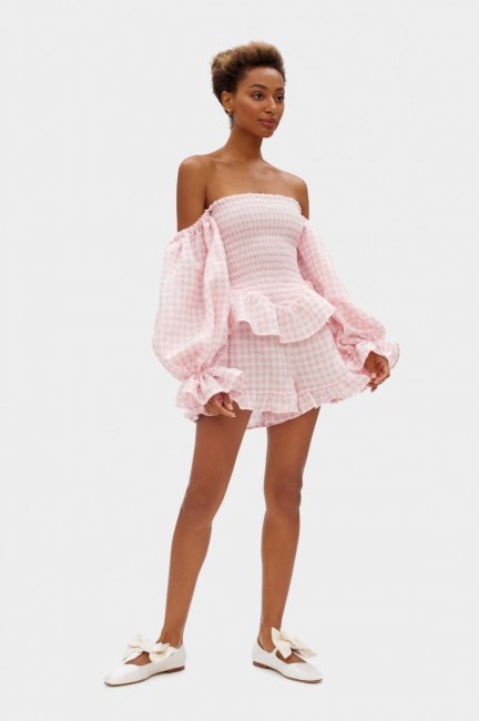 Atelier HandmadeSleeperРомантичний лляний комплект у рожеву клітинку українського бренду Sleeper обов'язково має з'явитися у вашому гардеробі цього сезону. Шорти з ніжними оборками та топ на резинці з об'ємними рукавами підійде як для пляжного відпочинку, так і для романтичного побачення. Цей практичний та вишуканий ансамбль стане вашим фаворитом у теплу погоду.