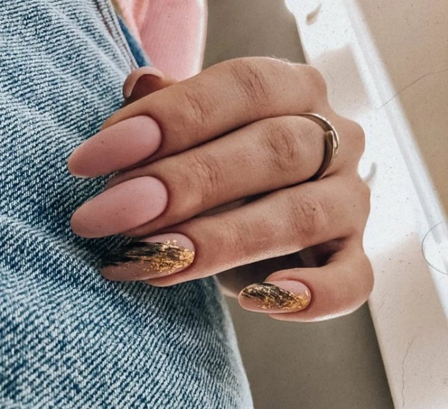 Новомодно и молодежно будет смотреться тандем с техникой омбре. Попробуйте сделать акцентными средний и безымянный пальцы. Для плавных переходов рекомендуется использовать розовый, абрикосовый, лавандовый, лососевый и песочный цвет. Подобный маникюр подойдет как для похода на свидание, так и на каждый день.