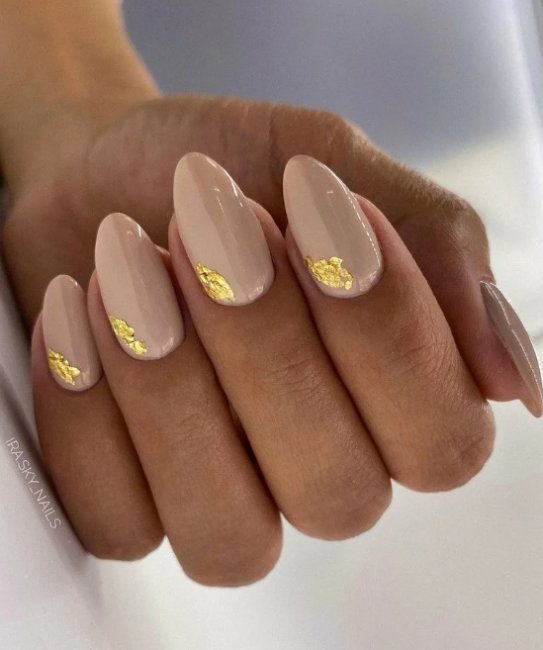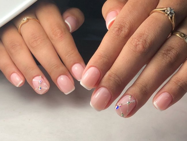 Еще одно красивое нежное сочетание — матовый бежевый топ и стразы. Можно подойти к оформлению ногтей с креативной стороны и украсить область лунки маленькими камнями, тем самым совместить в одном маникюре несколько дизайнов. Это будет смотреться не только красиво, но и необычно.