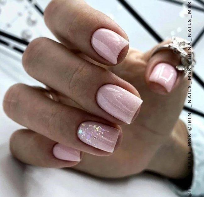 На ногтях он всегда выглядит очень женственно и лаконично. Идеально подходит для повседневной жизни, так как не привлекает к себе особого внимания. Но при этом такой гель-лак делает женские руки очень красивыми и ухоженными. Для более яркого и праздничного образа можно разбавить оформление ногтей глиттером.