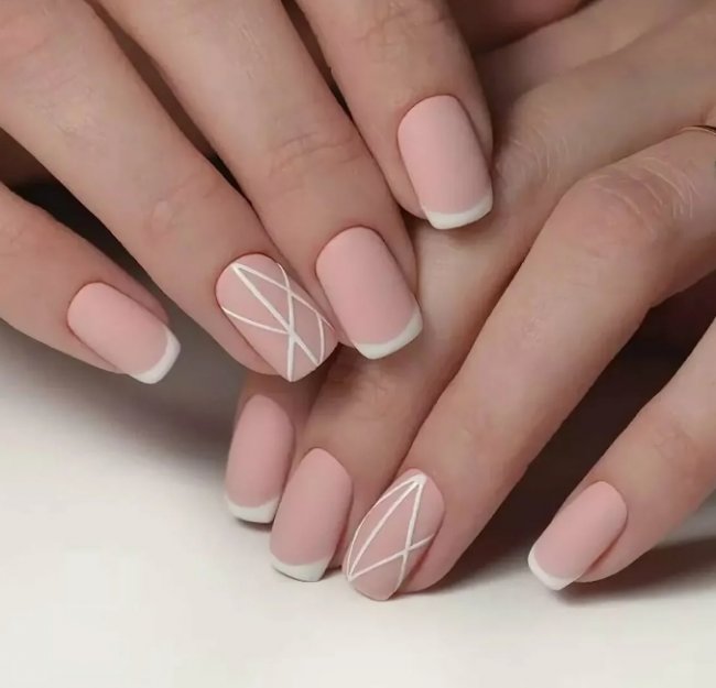 Особенно круто в 2023 году будет смотреться матовый дизайн ногтей с геометрией. Покройте ногти розовым лаком, а сверху нанесите ромбики или квадраты. Их можно добавить на один ноготь, а можно разместить сразу на всех. Также интересно будут смотреться полосы или маленькие точки. Из точек можно даже создать какой-то интересный узор или рисунок.