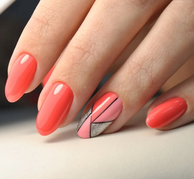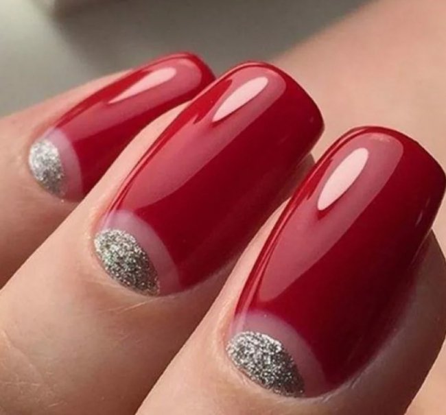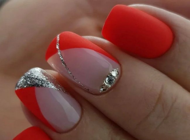 Красный гель-лак в сочетании с серебром — лучший вариант для похода на вечеринку или свидание. Такое оформление смотрится эффектно и выразительно. Нейл-мастера рекомендуют выбирать такой дизайн дамам с длинными ногтями или средней длины. Попробуйте нанести на красную основу полосы, ромбики или зигзаги серебристым гель-лаком. Так вы получите нестандартный дизайн.