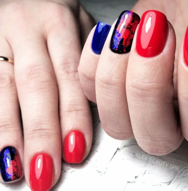 Интересно смотрится союз с синим цветом. Такой маникюр подходит неординарным и творческим личностям. Глубокие оттенки станут идеальным вариантом для создания эпатажного образа, а сочные и игривые тона стоит выбирать, если вы хотите получить легкий и ненавязчивый дизайн. Особой популярностью у девушек пользуется маникюр с морской тематикой или американским флагом.