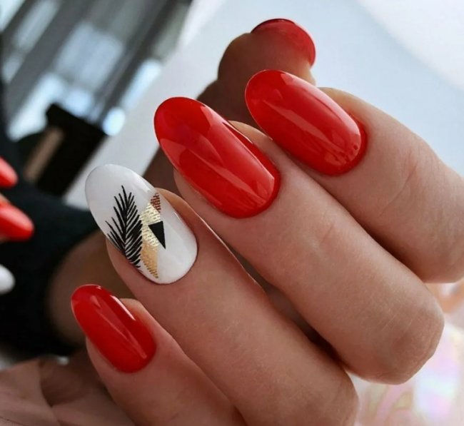 Красный маникюр прекрасен и без декора, но если вы добавите фольгу, он приобретет волшебный вид. Фольга способна сделать любой дизайн праздничным, она смотрится ярко и самодостаточно на ноготках любой формы. Ее можно расположить в хаотичном порядке, а можно создать какой-то узор.
