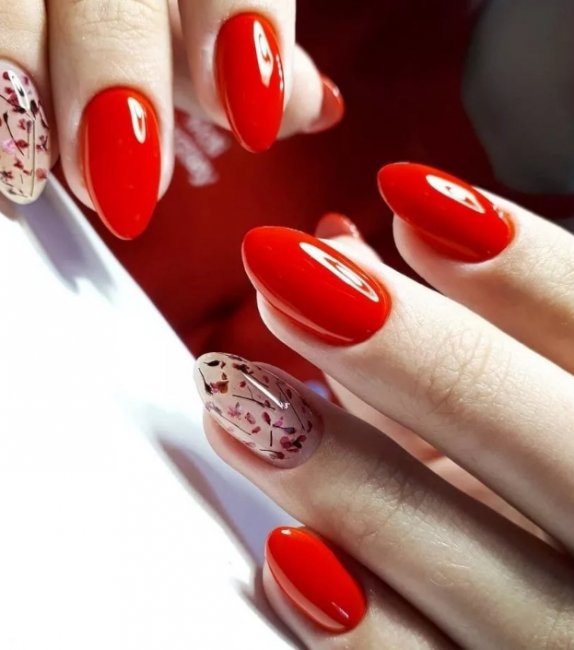 Весной девушкам хочется чего-то свежего, эстетичного и нежного. В моде будут всевозможные флористические мотивы — незамысловатые веточки, наклейки с цветами. С красным гель-лаком отлично сочетаются розочки, пионы, маки и тюльпаны. Их лучше наносить на один или два ногтя. Так маникюр будет выглядеть аккуратно и сдержанно.