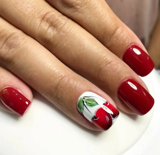 Вишневый оттенок — соблазнительное воплощение смелого подхода к красному маникюру. Он подходит молодым девушкам. Полупрозрачные или блестящие пайетки станут отличным дополнением, придадут нотку свежести и яркости.