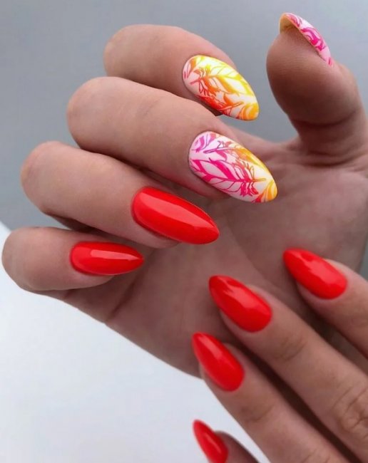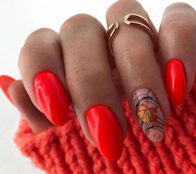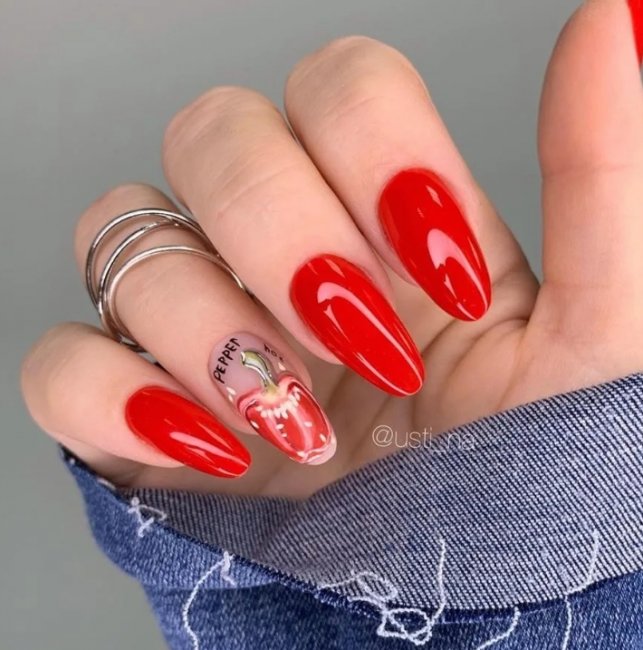 Красный гель-лак в сочетании с рисунками позволяет выразить любое настроение и реализовать самые смелые идеи. На ногти можно нанести любой контрастный рисунок кистью или использовать специальные наклейки. Довольно серьезный красный дизайн превращается в восхитительный маникюр с ноткой шарма. Рисунки могут быть нанесены как на один, так и на несколько ноготков. Это может быть любой узор, абстрактный рисунок или иллюстрация с цветами.