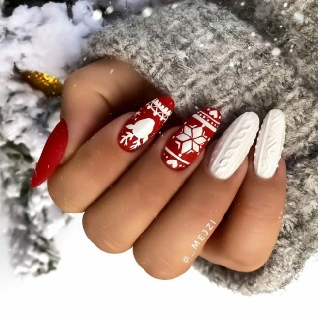 Более серьезным женщинам подойдет «вязаный» маникюр. В этом случае красный цвет часто сочетают с белым — такой дизайн смотрится мягко и нежно. Не менее интересен однотонный маникюр. Некоторым он может показаться слишком скучным и простым, но он входит в самые стильные идеи осеннего маникюра. Если вы покроете ногти матовым топом, получите элегантный дизайн.