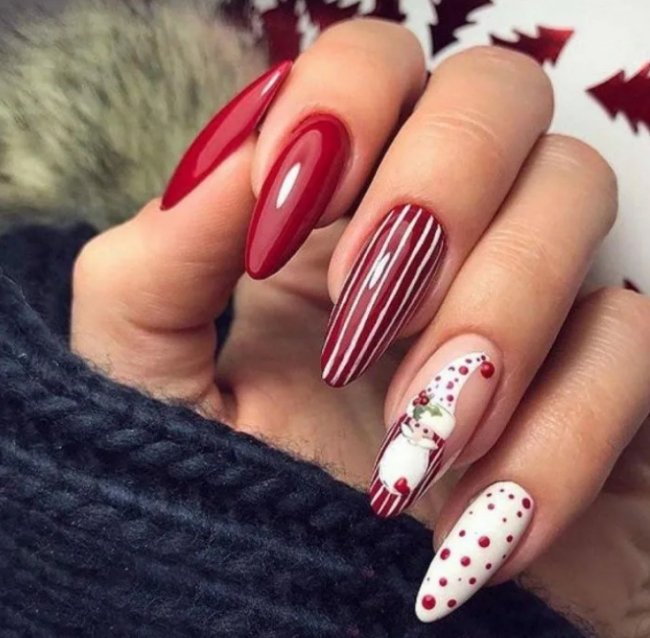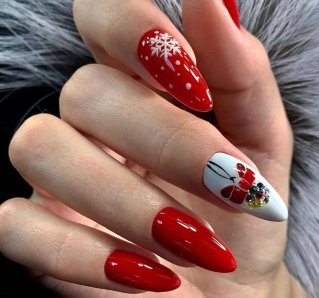 Самый популярный зимний вариант — тандем красного лака с серебром. Такое сочетание смотрится невероятно красиво и создает ощущение торжества. Перед новогодними праздниками девушки любят украшать ноготки стразами, блестками, бусинками и пайетками. Обратите внимание: их не должно быть слишком много. Маникюр с большим количеством декора будет смотреться глупо и несуразно.