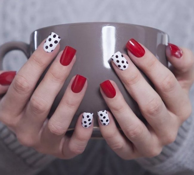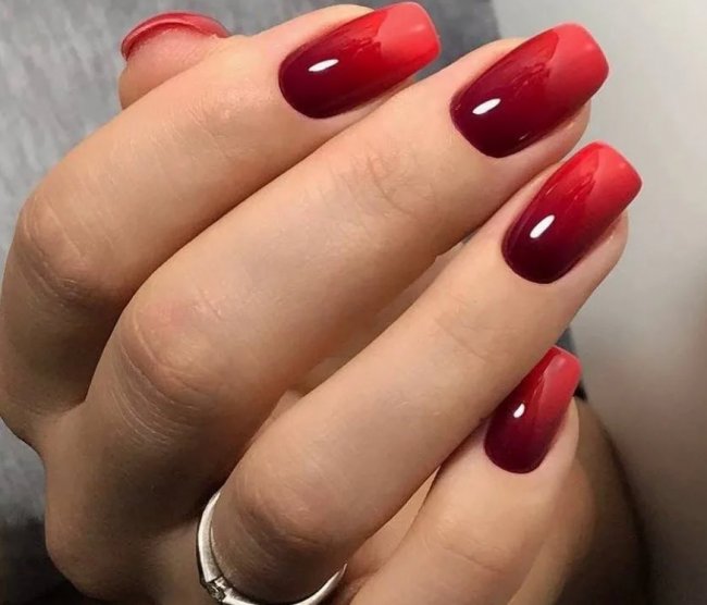 Мило будут смотреться на красных ногтях божьи коровки и бабочки. Еще один крутой вариант — мультяшные герои. На красной подложке чаще всего можно встретить Микки и Минни Мауса. В списке топовых оформлений находится техника градиент — плавные переходы оттенков делают маникюр невероятно шикарным. Можно еще попробовать «разные руки»: ногти на одной руке покрыть лаком красного цвета, а на другой — каким-то другим цветом.