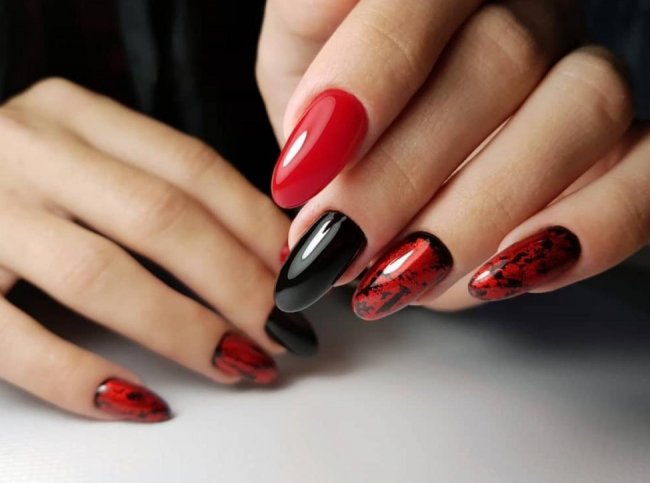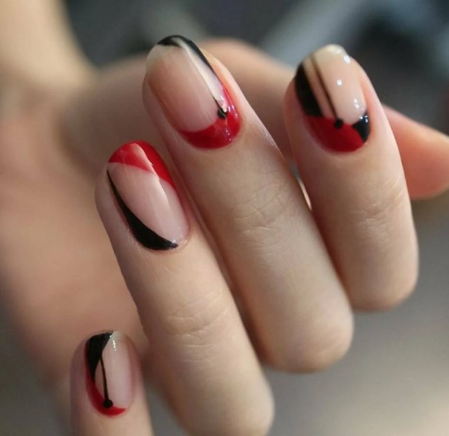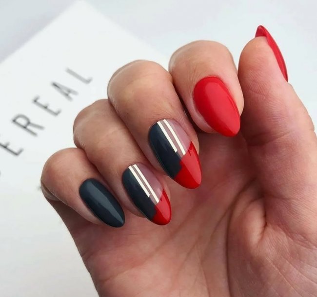 Тандем с черным позволит создать смелый и выразительный дизайн. Особенно круто такое сочетание смотрится на длинных ногтях. Этот вариант оформления ноготков обычно предпочитают яркие, сексуальные, уверенные в себе девушки. Здесь актуальна техника омбре, френч и абстрактный дизайн. Такой маникюр подойдет и для повседневной носки, и для офисного образа.
