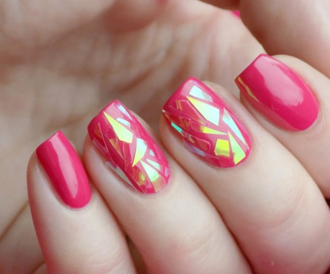 Модный тренд, который становится все популярнее. Нейл-мастера рекомендуют выбирать для создания дизайна прозрачную или разноцветную декоративную пленку. Акцентным лучше делать один ноготь. Можно попробовать соединить этот дизайн с французским маникюром. Такой тандем будет выглядеть очень необычно.