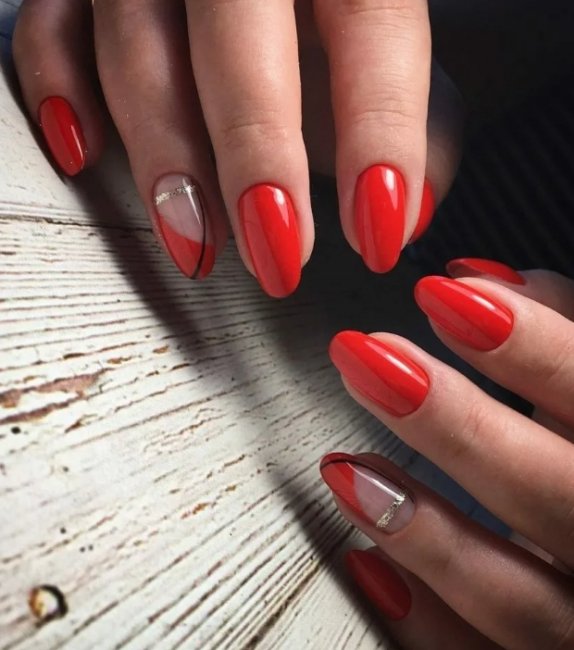 Золото — еще один прекрасный вариант дополнения к красному маникюру. Такой дизайн выглядит аристократично и дорого. В топ самых популярных оформлений ноготков входит красный маникюр с золотой лункой. Попробуйте отойти от привычного дизайна и сделайте лунку в виде треугольника.