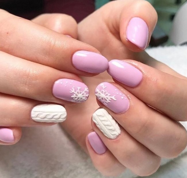 Самый зимний дизайн — «вязаный маникюр», когда каждый ноготь будто одет в теплый свитер. Такое оформление приносит покой и смотрится очень уютно. Красиво будет смотреться тандем розового и серого цвета. А если включить фантазию и добавить оттенок абрикосового, то получится создать по-настоящему эффектный маникюр. Будет казаться, будто на ногтях мороз выковал узор, только не в синей палитре, а в розовой.