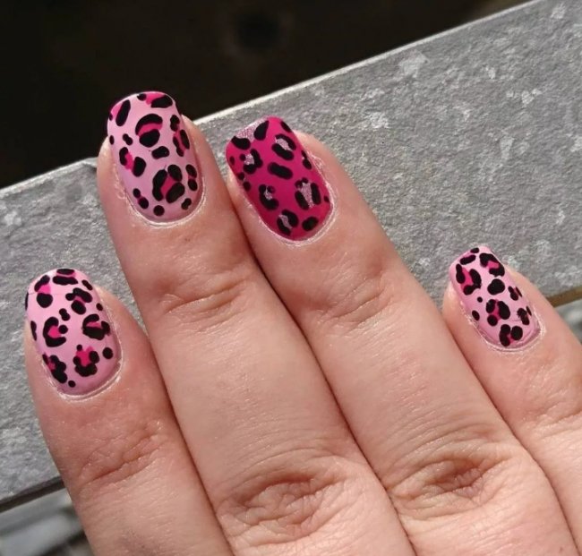 Леопардовый принт на розовой подложке смотрится эффектно. «Хищный» рисунок обычно выбирают яркие девушки, которые любят быть в центре внимания. Этот тренд некоторое время не пользовался спросом, но в 2023 году снова входит в модные тенденции. Если покрыть ногти еще матовым топом, эффект будет невероятным.