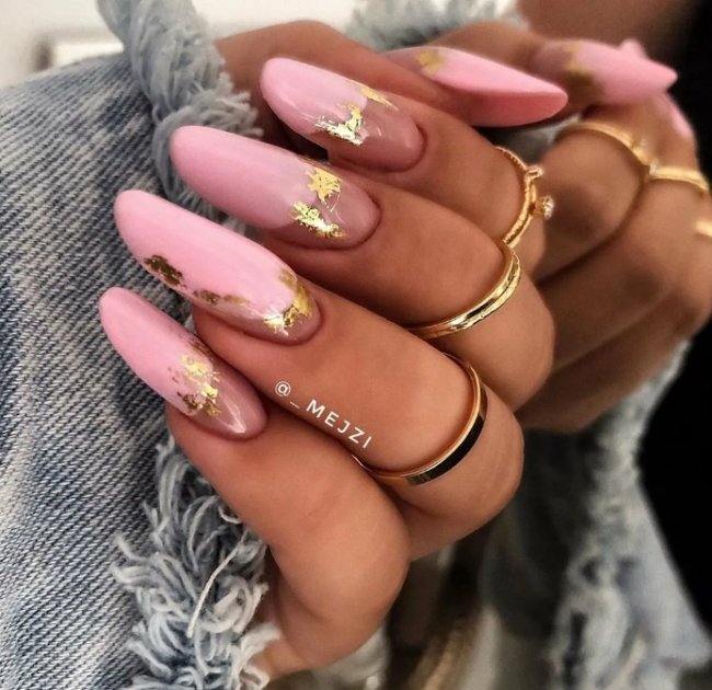 Это одна из самых красивых новинок 2023 года. Фольга придает ногтям нотку шарма и эпатажа, с ней маникюр мгновенно приобретает дорогой вид. Золотые элементы всегда создают невероятный эффект. Маникюр подойдет на любой случай жизни, вы можете выбрать такой дизайн даже на свадьбу.