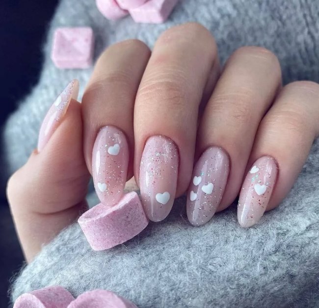 Это очень нежный дизайн, который любят выбирать девушки-романтики или милые девочки. Также такой дизайн пользуется спросом на день Святого Валентина. Маленькие сердечки на розовом фоне смотрятся лаконично и сдержанно. Маникюр прост, но выглядит обворожительно.