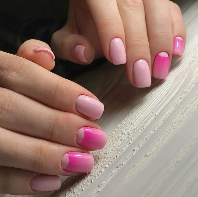 Френч актуален всегда, но в розовом цвете он смотрится гораздо круче. Отойдите от классики и покройте линию «улыбки» гель-лаком цвета фуксия. Также можно попробовать изменить форму края. Интересно будет смотреться треугольная «улыбка» или твист-френч. Во втором случае актуально сочетание розового с фиолетовым, синим, лиловым цветом.