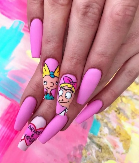 Этот дизайн поможет вам вернуться к субботним утренним мультфильмам и вкусным конфетам из магазина на углу. Именно такими будут ассоциации при виде ноготков в стиле поп-арт. Sailor Moon и клубничная Hubba Bubba были мечтой каждого подростка. Это время прошло, но это не означает, что у вас нет возможности пережить его заново.